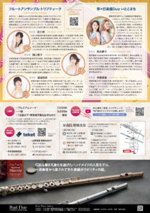 | 2018年12月20日 | 東京 | 【 A7コンサート2018 】 日時:2018年12月20日(木) 開場18:30 開演19:00 会場:カワイ表参道コンサートサロン「パウゼ」 新作『フルートソナタ第1番』を初演 演奏:鈴木舞(フルート)、綿引浩太郎(ピアノ) |